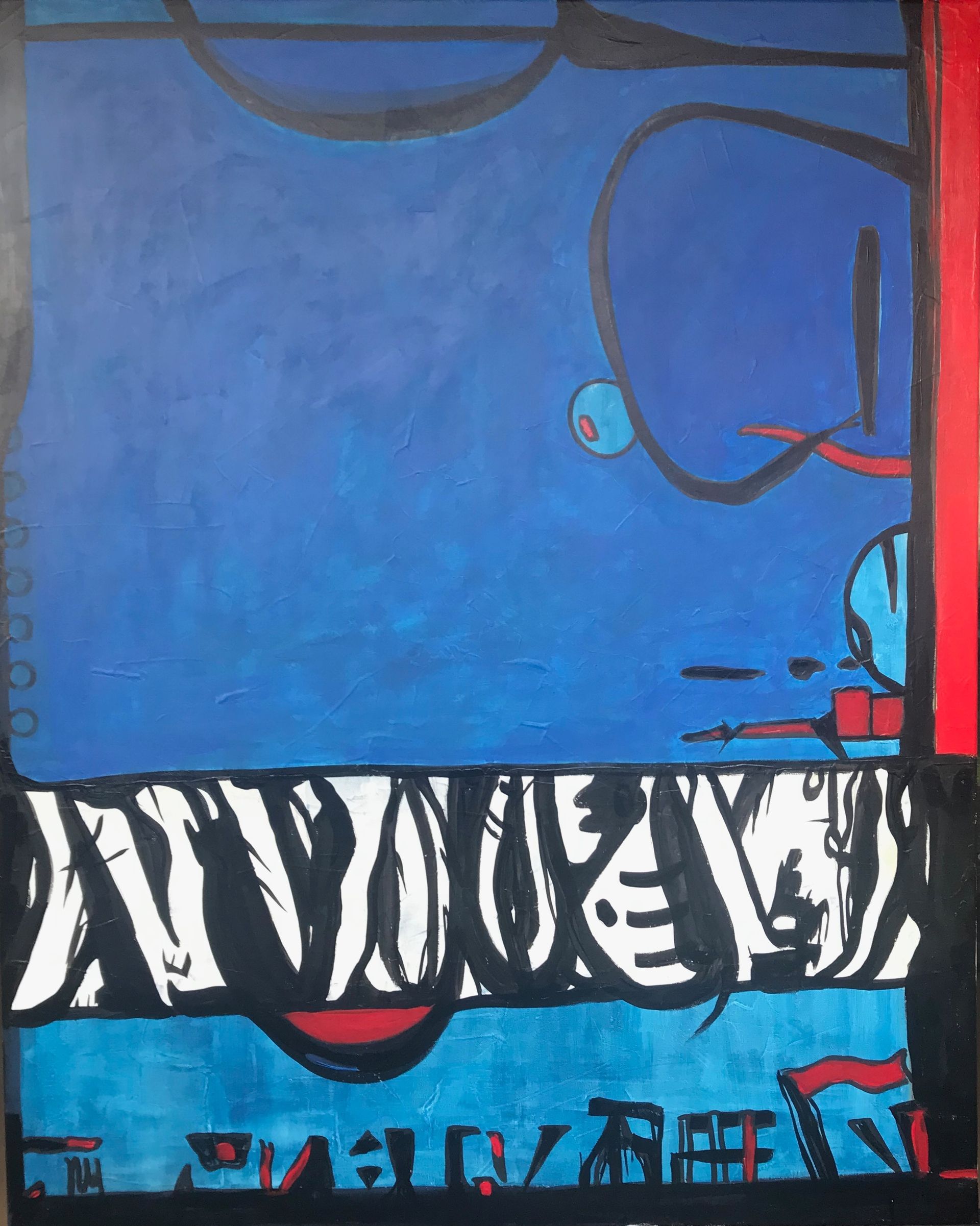L'espace de la toile est un lieu de méditation, un théâtre de projections. La présence indéfinie, ses pouvoirs, sa menace, en fait, l'imagination, tel est le sujet. Le travail réunit figuration, abstraction et conceptualisme.